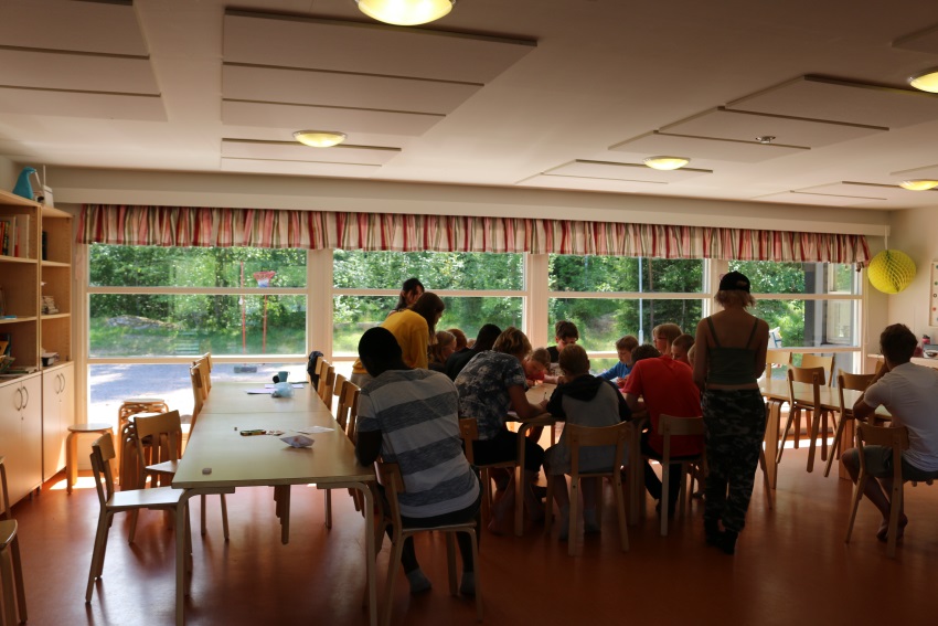 Mallinkaisten leirikeskuksen tunnelma on rauhallinen, liiterissä pilkotaan puita ja ulkopöydän ääressä pieni tyttöporukka juttelee auringonpaisteessa. Sisällä leirikeskuksessa meno on vilkkaampaa: ohjaajat valmistelevat tulevaa työskentelyä ja lapset touhuavat vielä hetken omiaan odotellessaan mitä tänään on vielä luvassa. Tila on täynnä puheensorinaa ja olo on heti tervetullut, kun jokainen vastaantuleva ohjaaja tervehtii iloisesti kätellen.