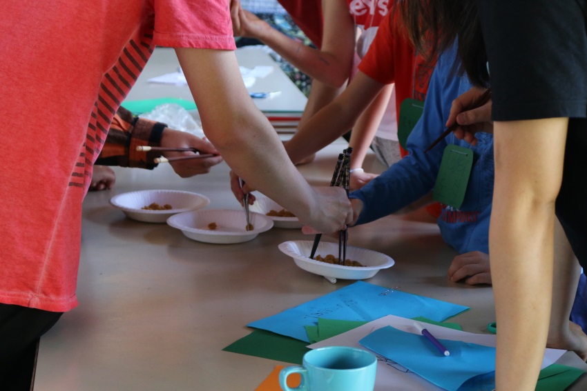 Da Jeong Son ja So Hyun Moon Etelä-Koreasta opettavat syömäpuikkojen käyttöä.