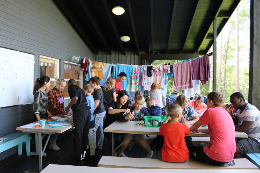 Tulee tieto, että kuistilla on viiden minuutin päästä alkamassa leiriläisille askartelua. Selän takana nuoret kirjoittavat nimilapuille nimiään suomeksi että koreaksi, samalla kun Dominic Leung ja Martina Chun Hong Kongista kertovat kokemuksistaan kahdesta leiristä. He ovat olleet myös edellisen viikon kansainvälisellä leirillä ohjaajina, jolloin leiriläiset olivat nuorempia.