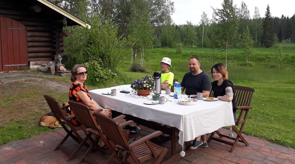 – Taloista käytiin aikanaan kovaa polemiikkia, voiko Hämeeseen ylipäätään rakentaa karjalaistyyliin, Maija Koivuniemi muistelee.Kuvassa vasemmalta Maija, Mikko, Timo ja Karoliina