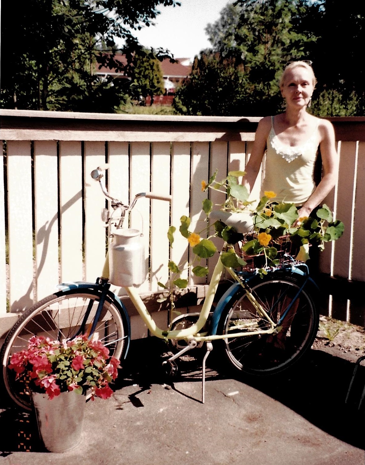 Arja Hyvösen idean mukaan roskakatos muutettiin pyöräsuojaksi. Arjan oma pyörä on kukkivaa mallia.
