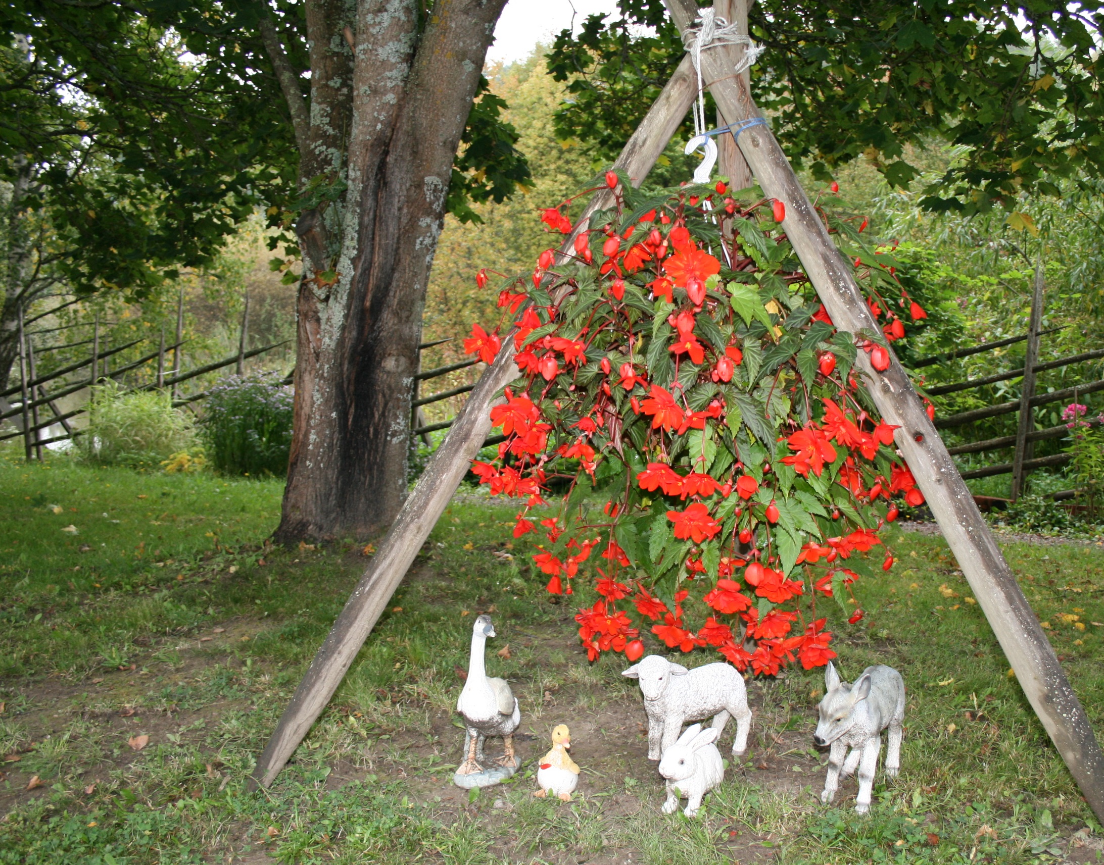 Heinäseiväskehikossa riippuva karjalanneito on jo 17-vuotias. Ritva Laine on saanut sen talvehtimaan hyvin, niin että kukasta on ollut iloa pitkään.