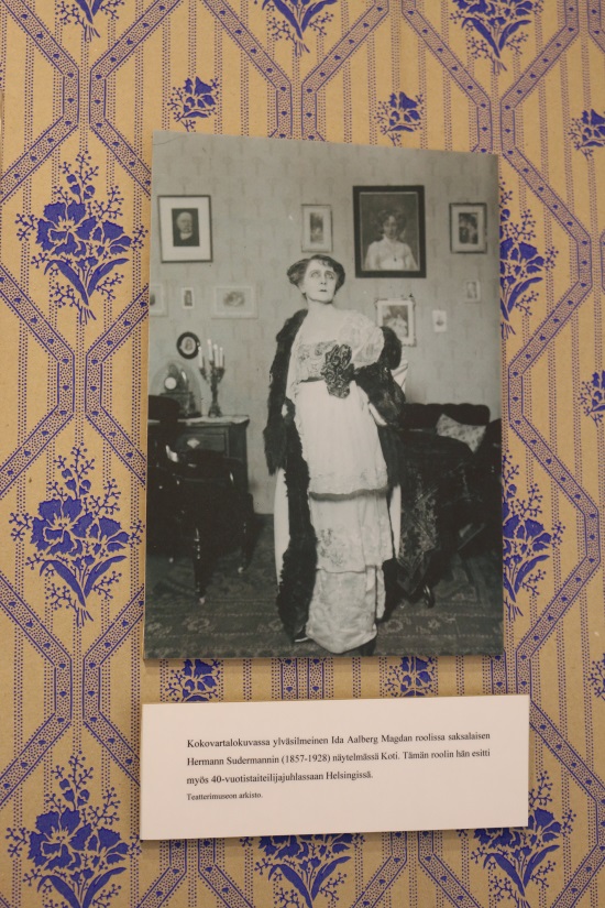 Viimeinen huone museossa on Idan ”teatterihuone”. Katse kiinnittyy tietysti ensimmäisenä nurkan vitriinissä olevaan iltapuvun näköiseen mekkoon, joka on jäljennös yhdestä Idan teatteriasusta. Pöydän päällä vitriinissä on Idan roolivihon kannet. Kannet ovat jykevän näköiset ja kuva niissä mahtipontinen.