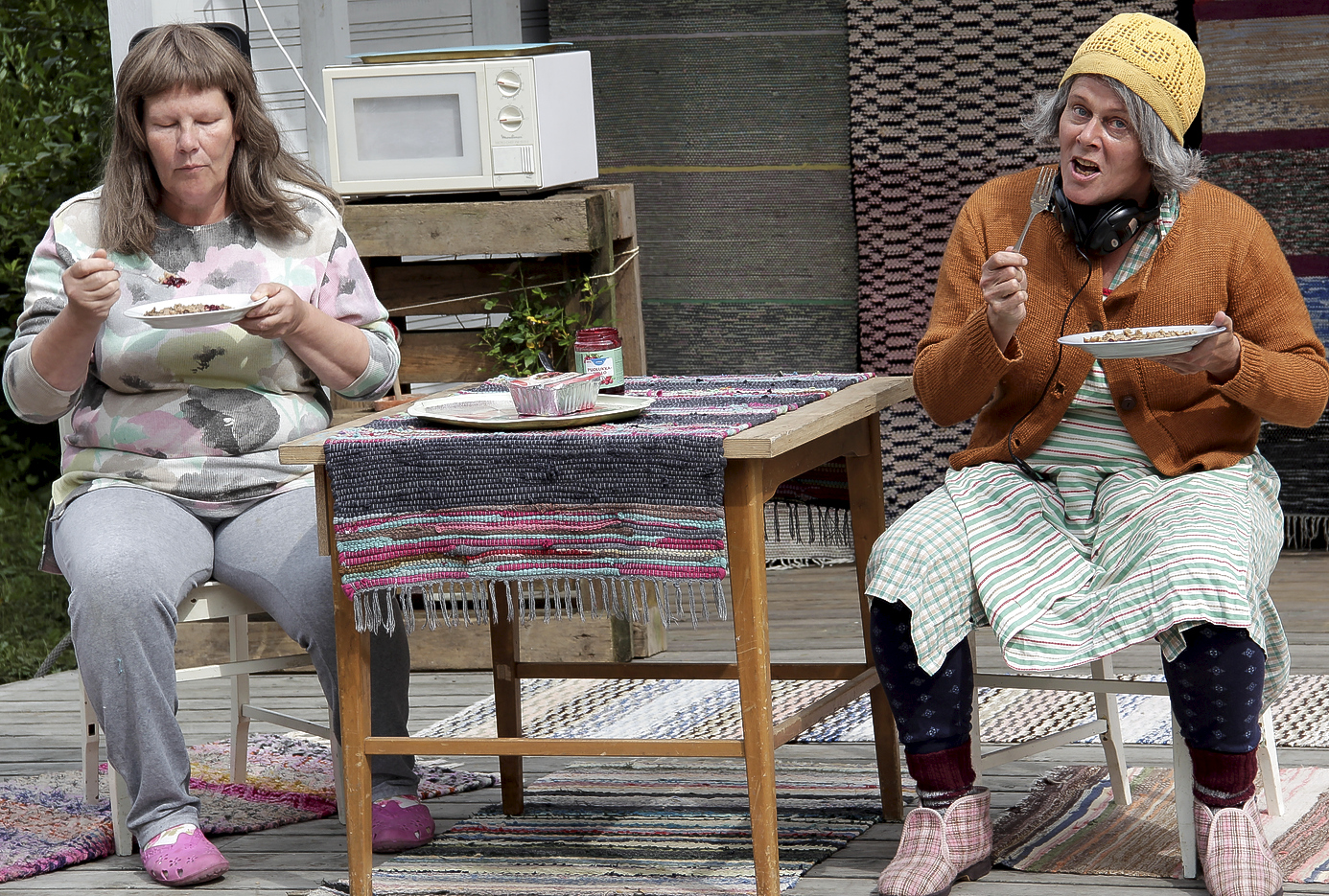 Maksalaatikko ei naisille ole tämän näytelmän jälkeen maistunut, sen verta sitä tuli esityksissä laitettua suuhun. Kuva: Ville Säteri/Janakkalan sanomat