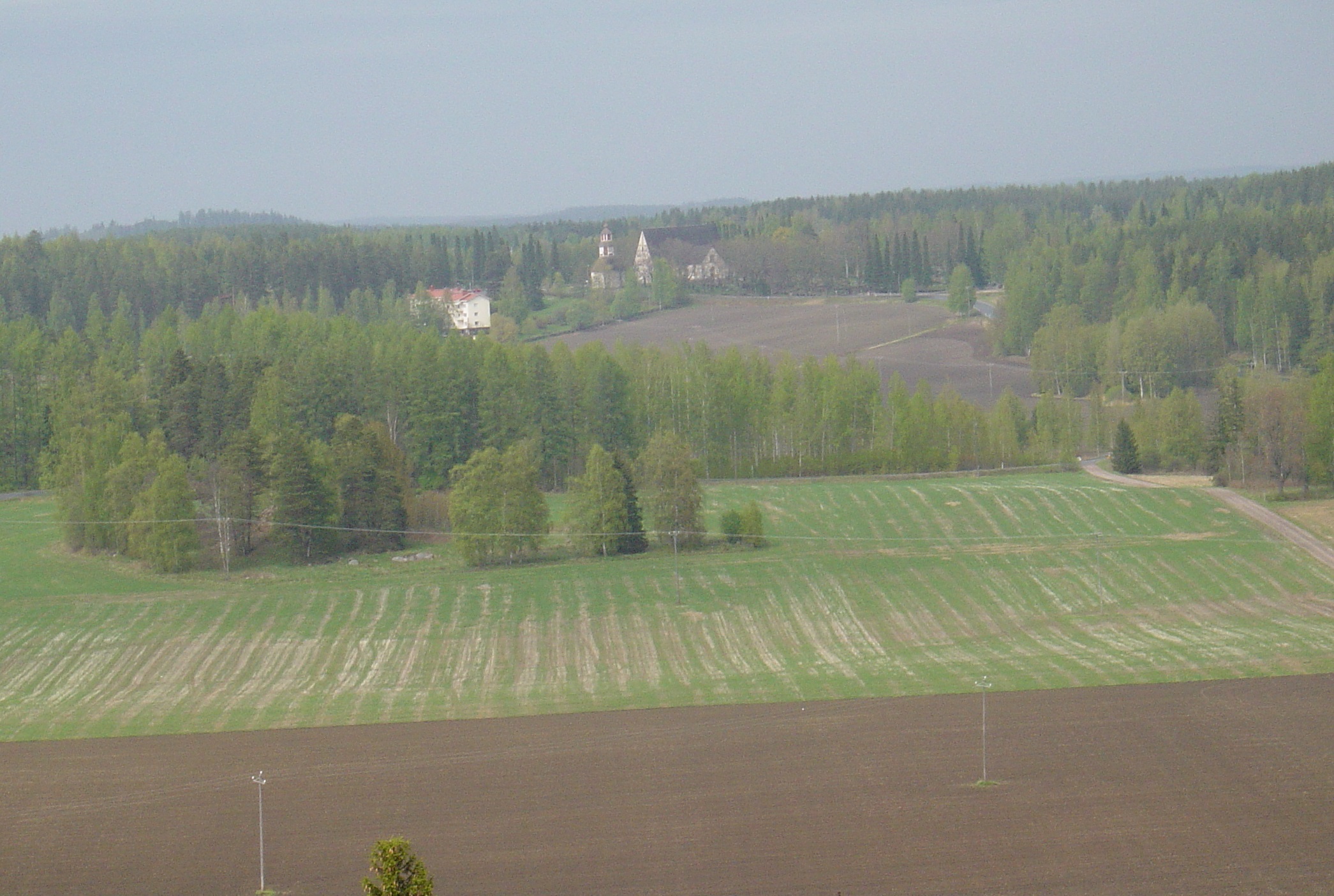 Hakoisten linnavuorelta läheltä Tarinmaan kirkonkylää aukeavat hienot näkymät joka ilmansuuntaan. Kuvan rakennukset ovat Tarinmaan koulu ja Janakkalan Pyhän Laurin kirkko.