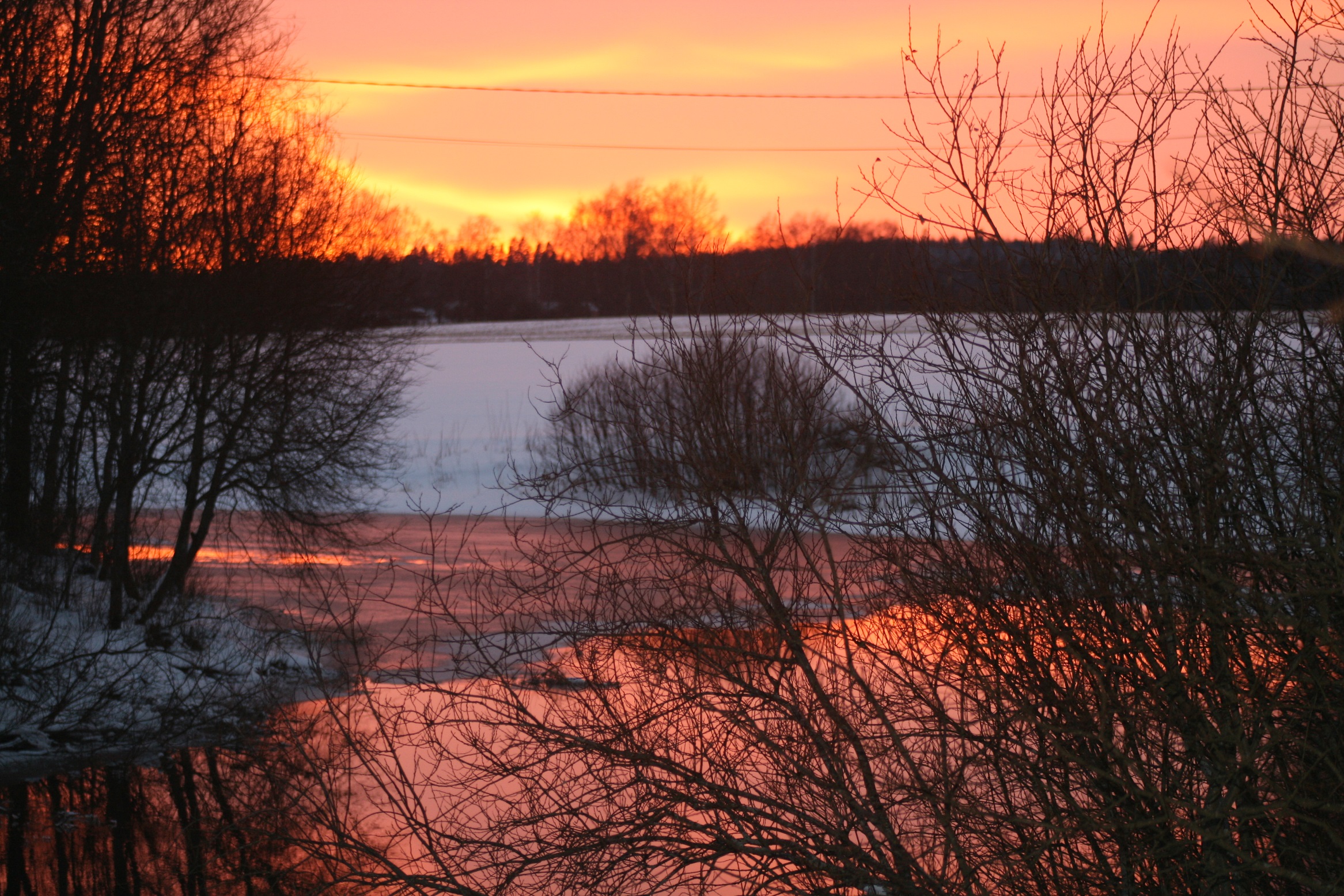 Laskeva aurinko värjää tulenpunaiseksi taivaan ja Hyvikkälänjoen.